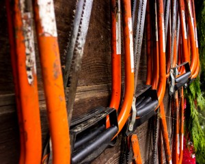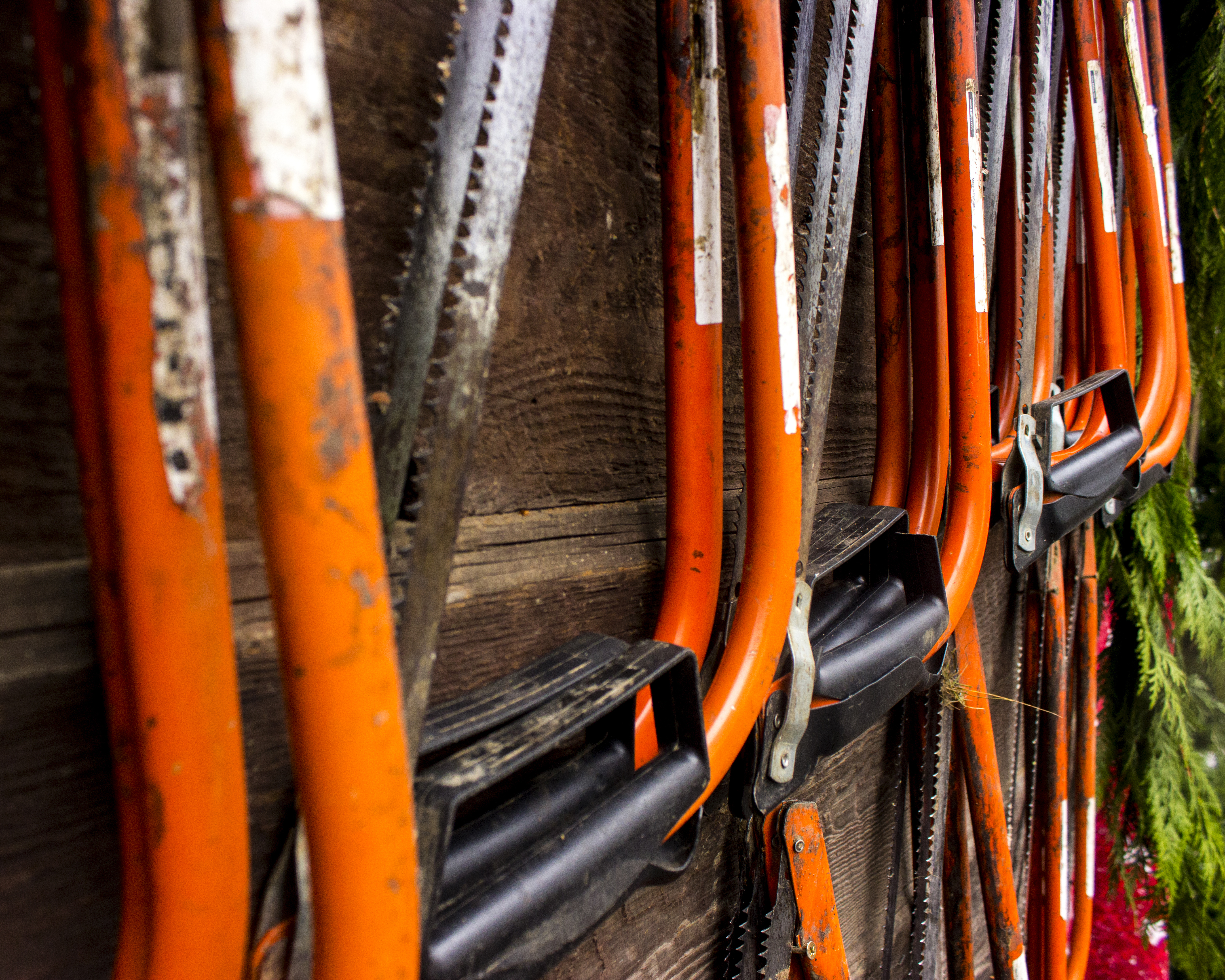 Saws hang along one of the many sheds of the 162 acre property of the Northern Lights Christmas Tree Farm in Pleasant Hill, Oregon. These saws are for the tree farm employees as well as customers who do not have a saw to cut down their tree of their choosing.