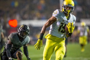 Oregon Ducks wide receiver Jalen Brown (#15) runs the ball in for a touchdown late in the fourth quarter against the Colorado Buffaloes. Oregon beat Colorado 41-24 on Saturday evening in Boulder, Colorado. Katie Pietzold, Oregon News Lab