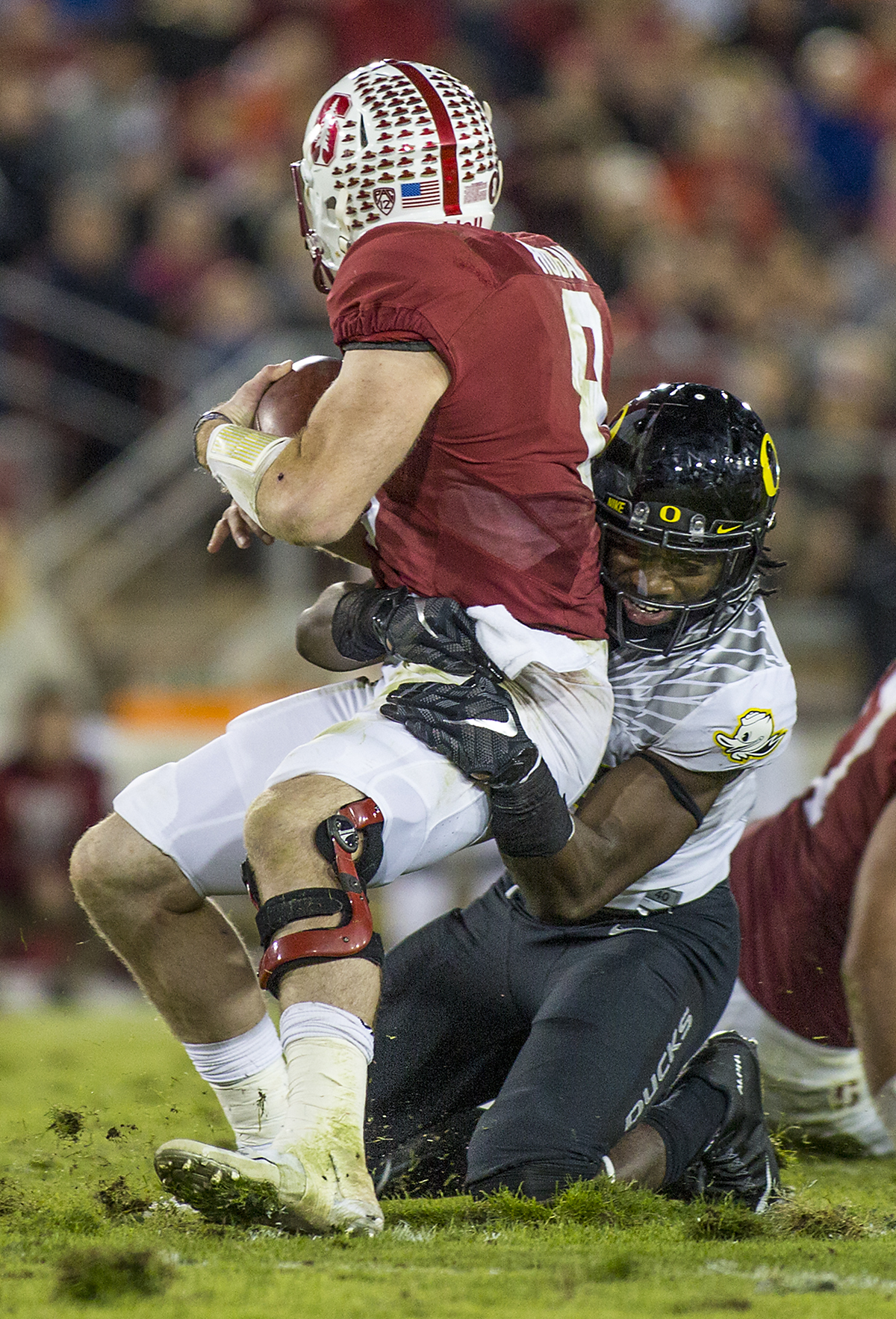 Oregon Ducks Torrodney Prevot (#86) tackles Stanford Cardinal quarterback Kevin Hogan (#8). The Oregon Ducks defeated the Stanford Cardinal 38-36 in Palo Alto, CA at Stanford Stadium Saturday evening after a missed two-point conversion by Stanford. The Ducks win gives them a 7-3 record and a potential to clinch the Pac-12 North divisional title as they prepare for next weeks’ game against USC in Eugene. Katie Pietzold, Oregon News Lab