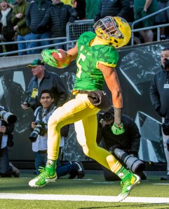 Oregon Ducks Taj Griffin (#5) celebrates in the end zone after scoring a touchdown against the Oregon State Beavers during the 119th Civil War at Autzen Stadium.