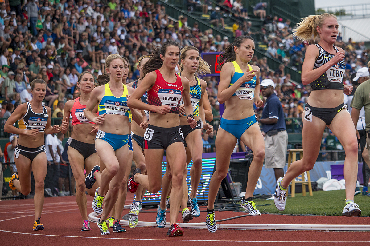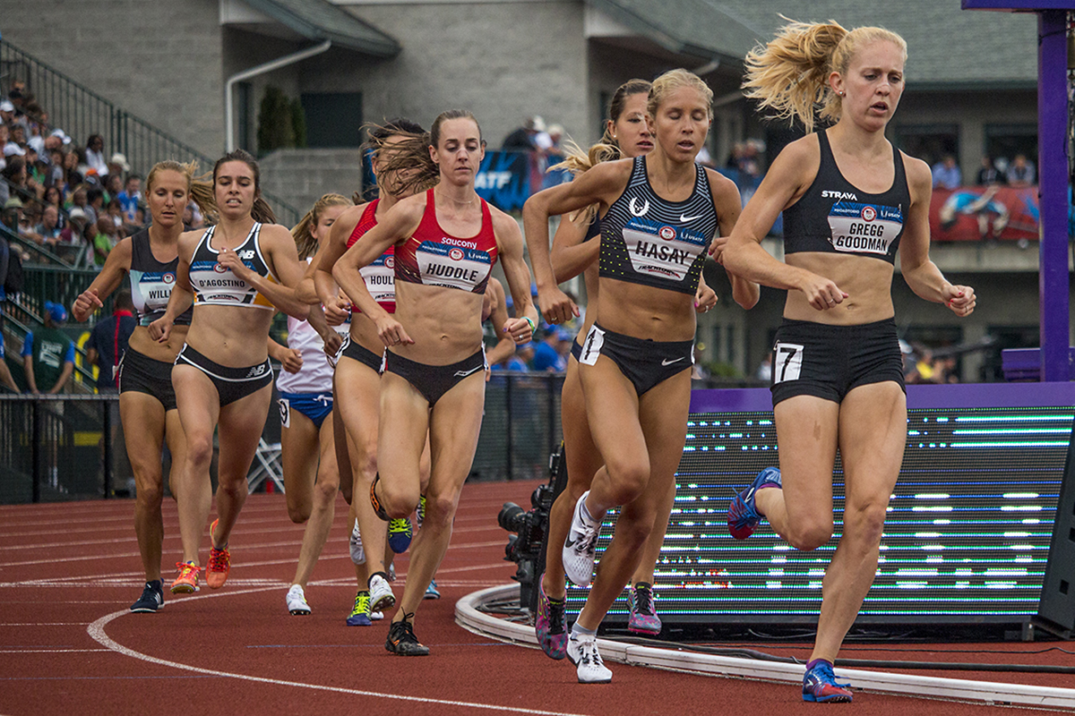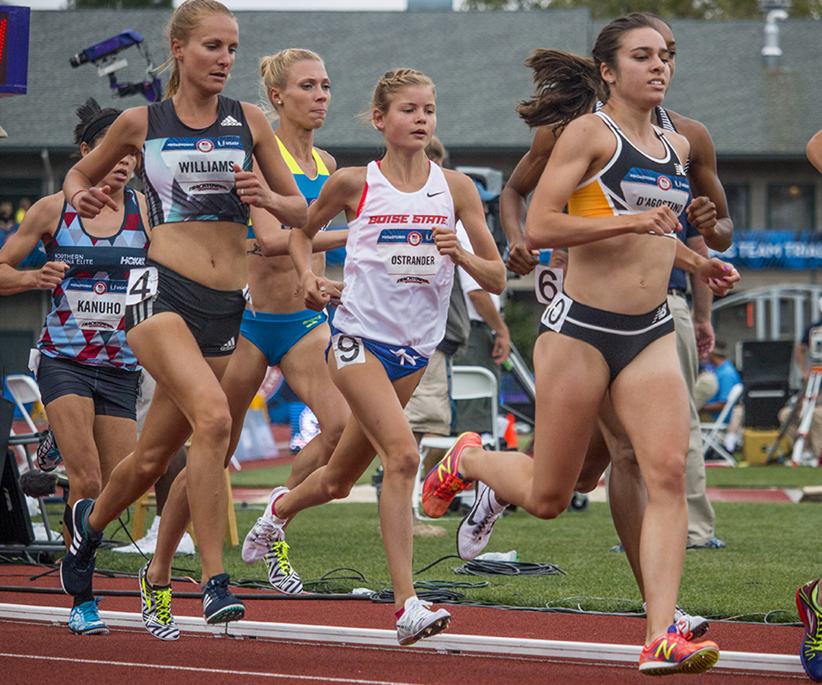 Adidas Rocky M E Alisha Williams, Boise State Bronco Allie Ostrander, and New Balance Abbey D’Agostino compete in the first round of the women’s 5,000 meter run. Day Seven of the U.S. Olympic Trials Track and Field were held Thursday at Hayward Field in Eugene, Ore. and will continue through July 10. Photo by Katie Pietzold