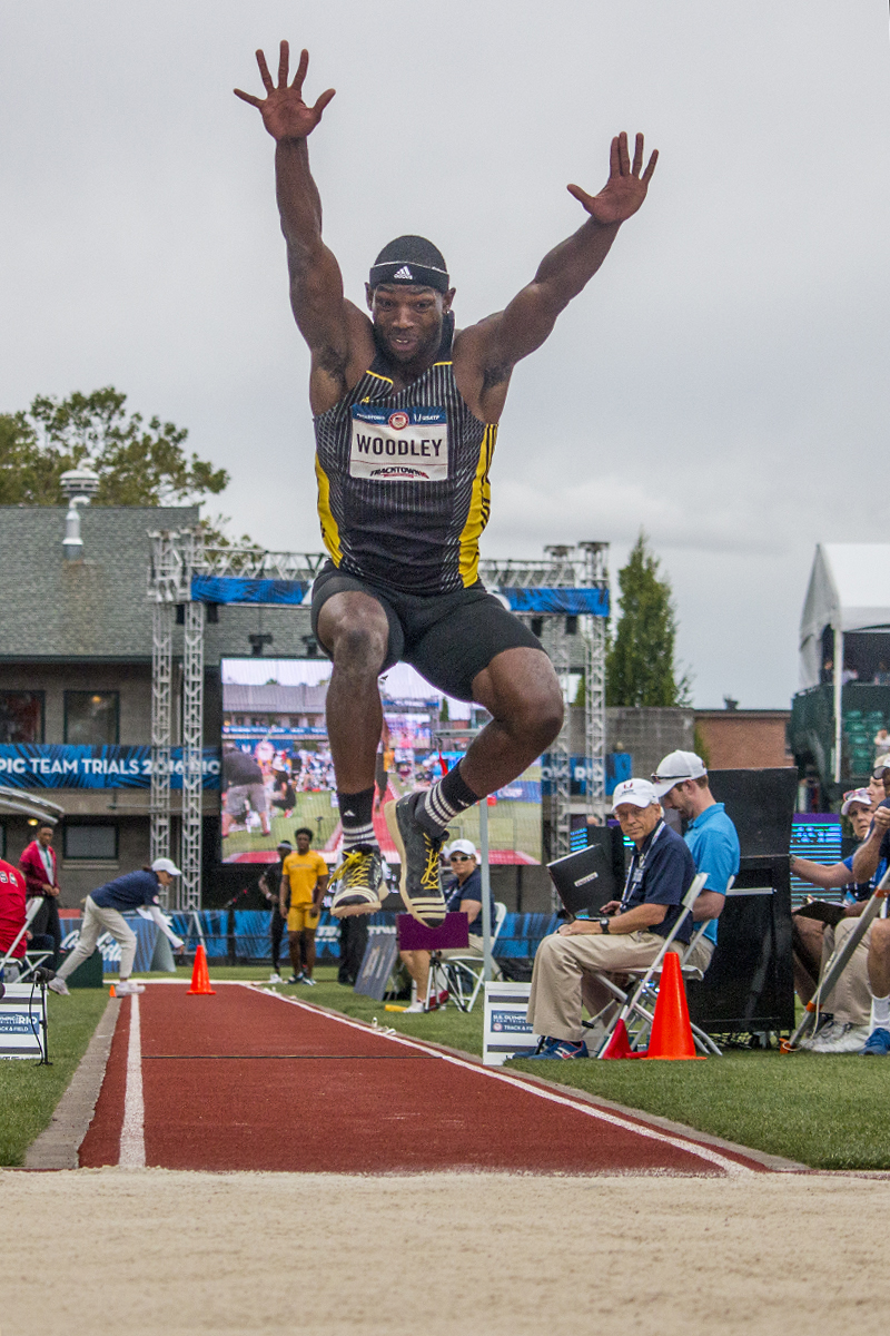 Adidas Ronald Woodley soars through the air during a triple jump attempt. Day Seven of the U.S. Olympic Trials Track and Field were held Thursday at Hayward Field in Eugene, Ore. and will continue through July 10. Photo by Katie Pietzold