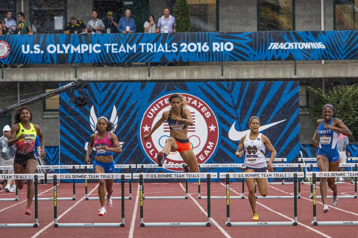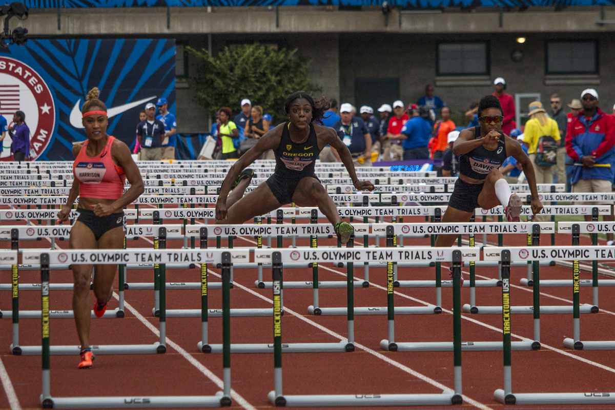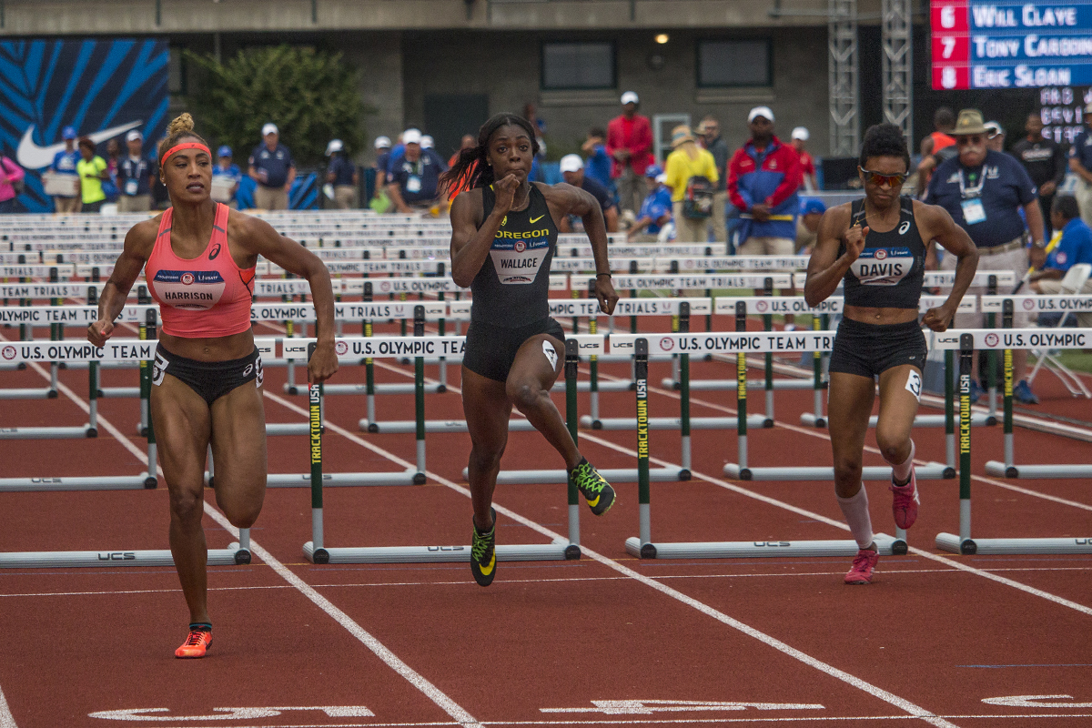 Asics Queen Harrison, Oregon Duck Sasha Wallace, and Tiana Davis compete in the prelims of the women’s 100 meter hurdles. Day Seven of the U.S. Olympic Trials Track and Field were held Thursday at Hayward Field in Eugene, Ore. and will continue through July 10. Photo by Katie Pietzold