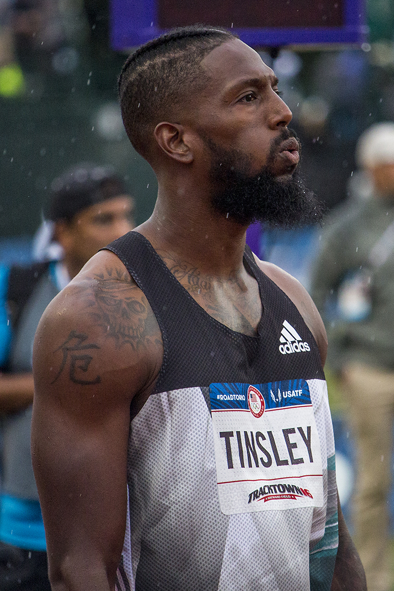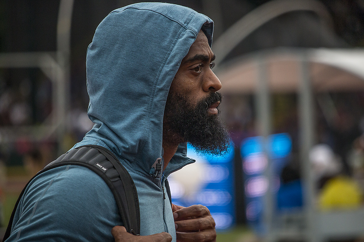 Tyson Gay walks towards the starter blocks in the prelims of the men’s 200 meter dash as it begins to rain at Hayward Field. Day Seven of the U.S. Olympic Trials Track and Field were held Thursday at Hayward Field in Eugene, Ore. and will continue through July 10. Photo by Katie Pietzold