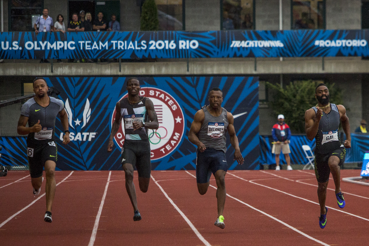 Wallace Spearmon, Adidas Curtis Mitchell, Ultimate Speed’s Arthur Delaney, and Tyson Gay race to the finish line in the prelims of the men’s 200 meter dash. Day Seven of the U.S. Olympic Trials Track and Field were held Thursday at Hayward Field in Eugene, Ore. and will continue through July 10. Photo by Katie Pietzold
