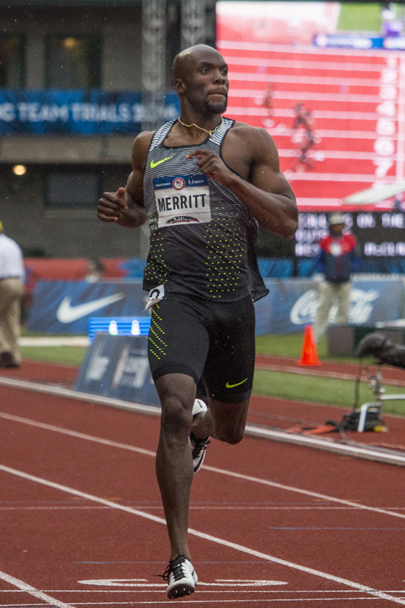 Nike’s LaShawn Merritt runs through the finish line during the men’s 200 meter dash prelims. Day Seven of the U.S. Olympic Trials Track and Field were held Thursday at Hayward Field in Eugene, Ore. and will continue through July 10. Photo by Katie Pietzold