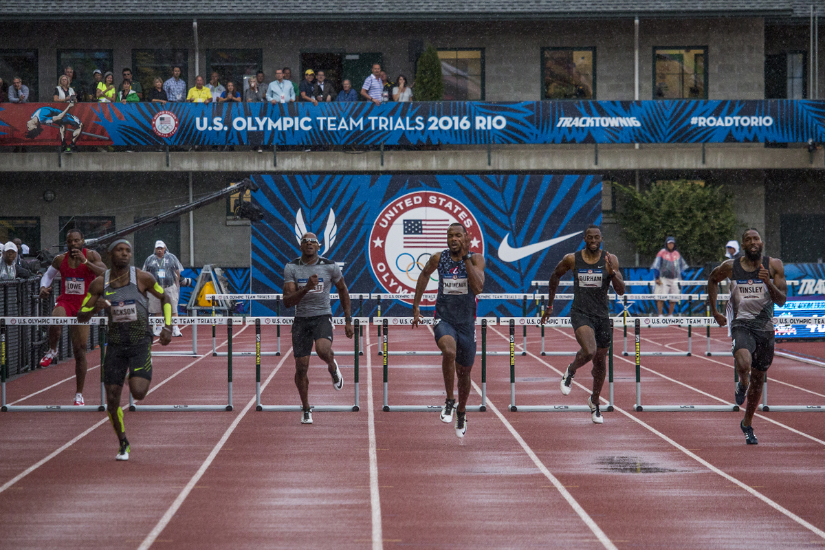 Hurdlers race towards the finish of the men’s 400 meter hurdles in the third heat. Day Seven of the U.S. Olympic Trials Track and Field were held Thursday at Hayward Field in Eugene, Ore. and will continue through July 10. Photo by Katie Pietzold