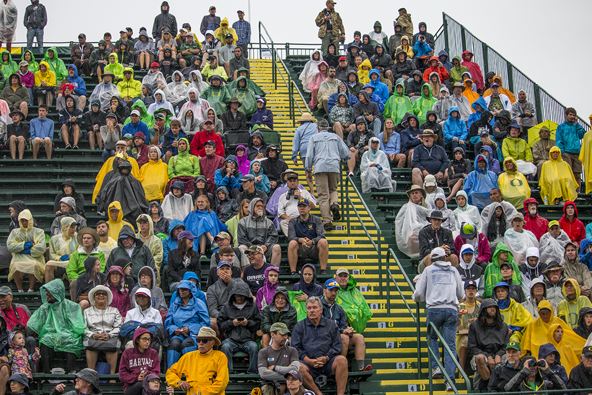 Spectators attempt to stay dry during a downpour in the afternoon. Day Seven of the U.S. Olympic Trials Track and Field were held Thursday at Hayward Field in Eugene, Ore. and will continue through July 10. Photo by Katie Pietzold
