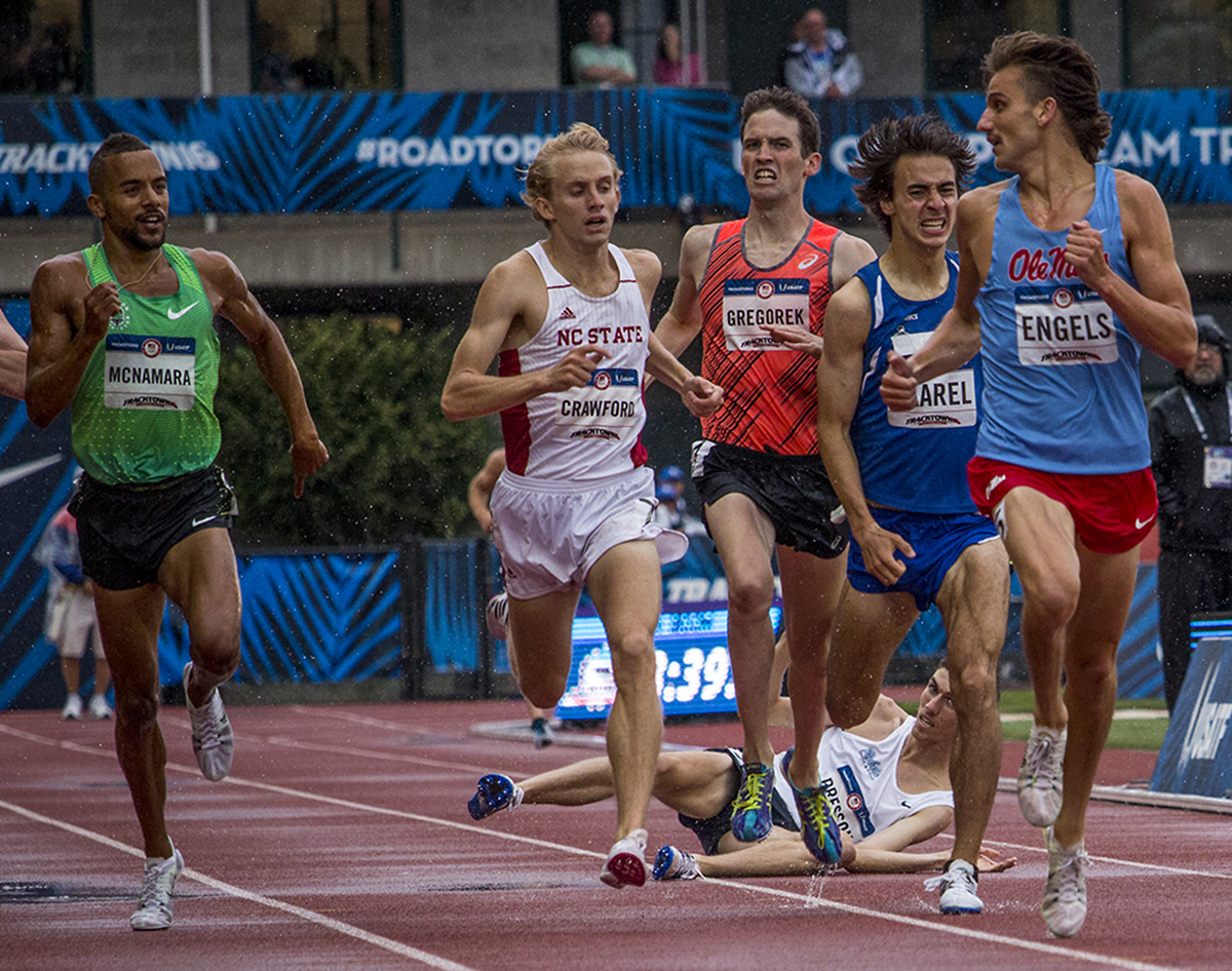Nike OTC Jordan McNamara exchanges glances with the front runner Ole Miss Rebel Craig Engels after Isaac Presson takes a tumble in the middle of the group towards the finish. Day Seven of the U.S. Olympic Trials Track and Field were held Thursday at Hayward Field in Eugene, Ore. and will continue through July 10. Photo by Katie Pietzold