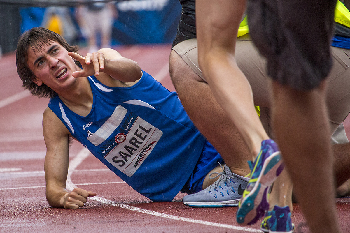 Colorado’s Ben Saarel reaches for assistance after collapsing to the ground as he finished running in the prelims of the men’s 1,500 meter run. Day Seven of the U.S. Olympic Trials Track and Field were held Thursday at Hayward Field in Eugene, Ore. and will continue through July 10. Photo by Katie Pietzold