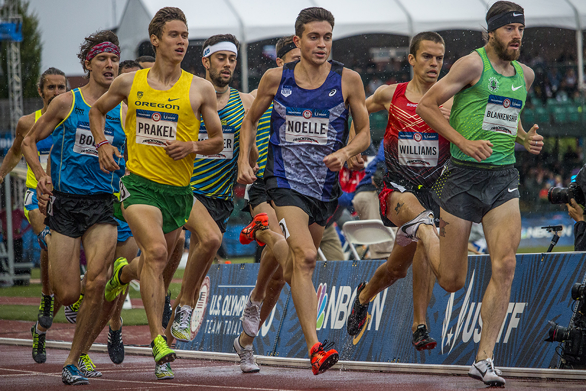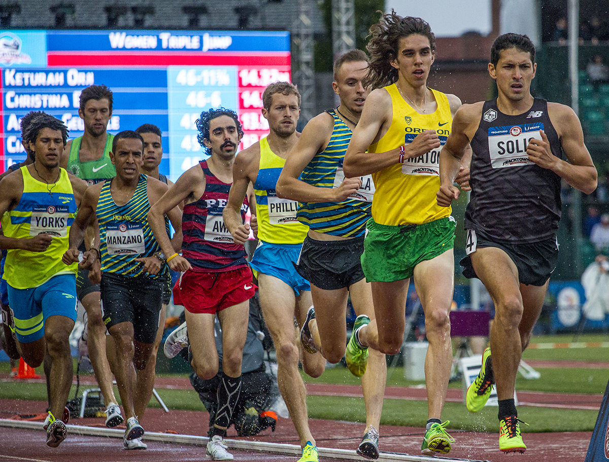 Runners compete in the prelims of the men’s 1,500 meter run as they get splashed with a downpour of rain. Day Seven of the U.S. Olympic Trials Track and Field were held Thursday at Hayward Field in Eugene, Ore. and will continue through July 10. Photo by Katie Pietzold