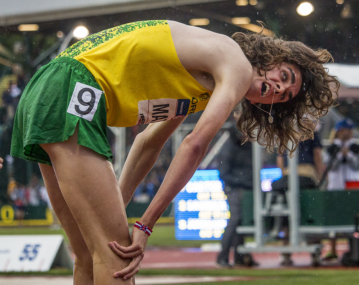 Oregon Duck Matthew Maton looks to the display board for his time after competing in the prelims of the men’s 1,500 meter run. Maton ran a 3:42.51. Day Seven of the U.S. Olympic Trials Track and Field were held Thursday at Hayward Field in Eugene, Ore. and will continue through July 10. Photo by Katie Pietzold