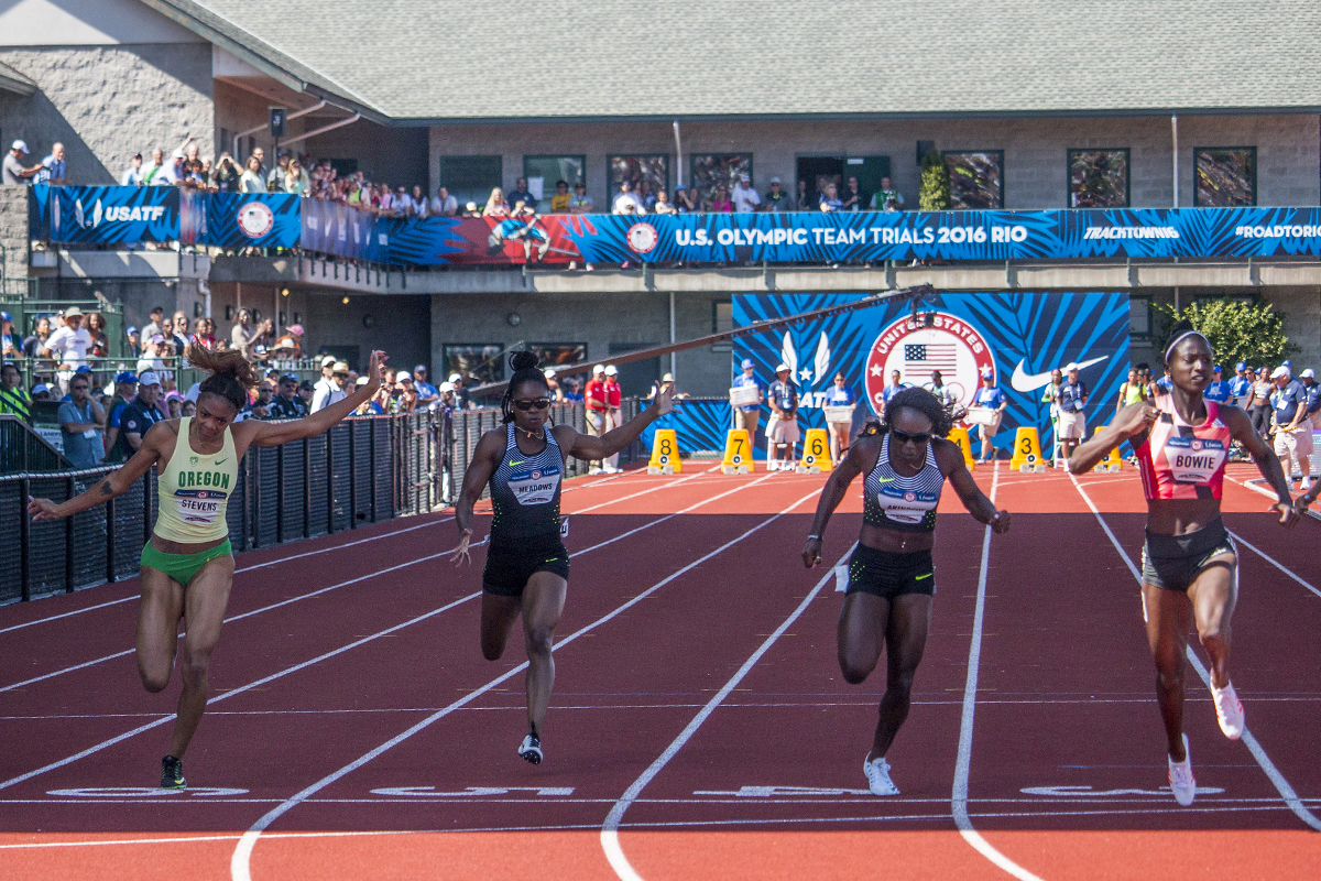 Oregon Duck Deajah Stevens runs through the finish of the women’s 100 semi-finals. Day Three of the U.S. Olympic Trials Track and Field were held Sunday at Hayward Field in Eugene, Ore. and will continue through July 10. Photo by Katie Pietzold