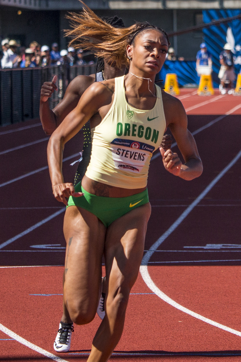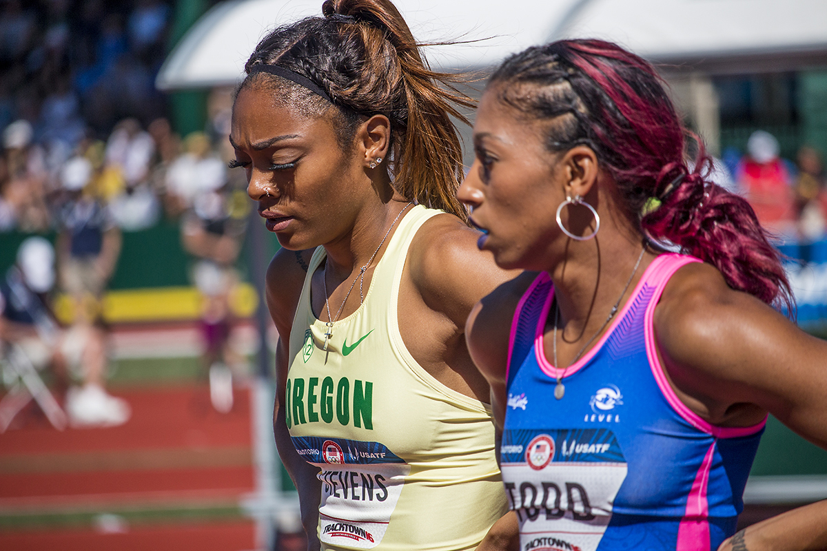 Oregon Duck Deajah Stevens and former Oregon Duck Jasmine Todd catch their breath together after running in the semi-finals of the women’s 100 meter dash. Day Three of the U.S. Olympic Trials Track and Field were held Sunday at Hayward Field in Eugene, Ore. and will continue through July 10. Photo by Katie Pietzold