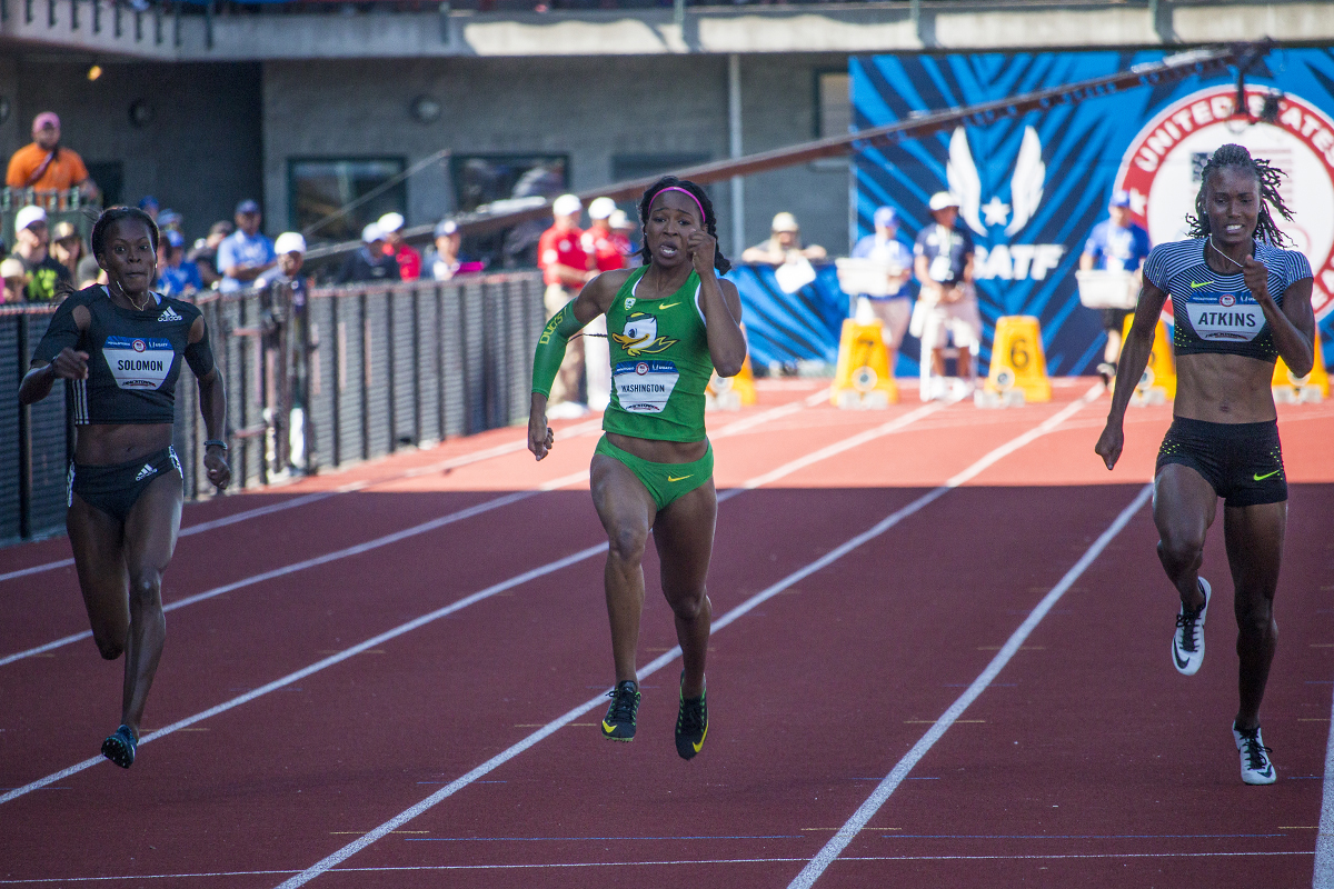 Adidas’ Shalonda Solomon, Oregon Duck Ariana Washington, and Nike’s Joanna Atkins sprint to the finish of the women’s 100 meter dash semi-finals. Day Three of the U.S. Olympic Trials Track and Field were held Sunday at Hayward Field in Eugene, Ore. and will continue through July 10. Photo by Katie Pietzold