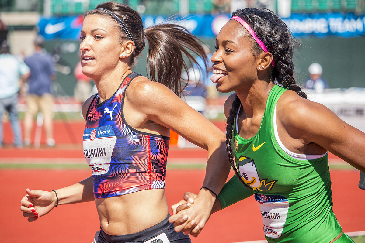 Oregon Ducks Jenna Prandini and Ariana Washington celebrate as they advance to the finals of the women’s 100 meter dash. Day Three of the U.S. Olympic Trials Track and Field were held Sunday at Hayward Field in Eugene, Ore. and will continue through July 10. Photo by Katie Pietzold