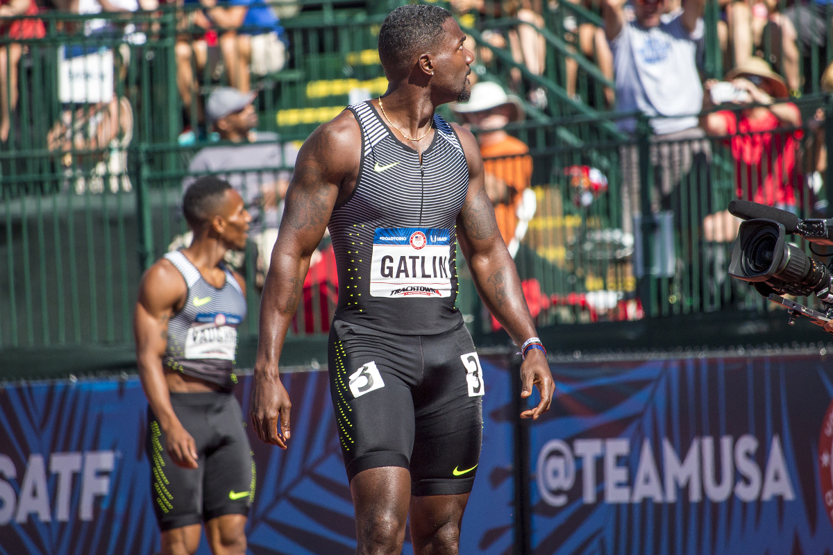 Nike’s Justin Gatlin looks up to the display board after running in the semi-finals of the men’s 100 meter dash. Gatlin ran a 9.83. Day Three of the U.S. Olympic Trials Track and Field were held Sunday at Hayward Field in Eugene, Ore. and will continue through July 10. Photo by Katie Pietzold