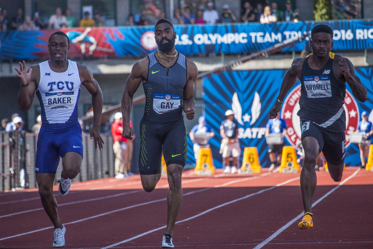 Ronnie Baker, Tyson Gay, and New Balance’s Trayvon Bromell kick it to the finish of the men’s 100 meter dash semi-finals. Day Three of the U.S. Olympic Trials Track and Field were held Sunday at Hayward Field in Eugene, Ore. and will continue through July 10. Photo by Katie Pietzold