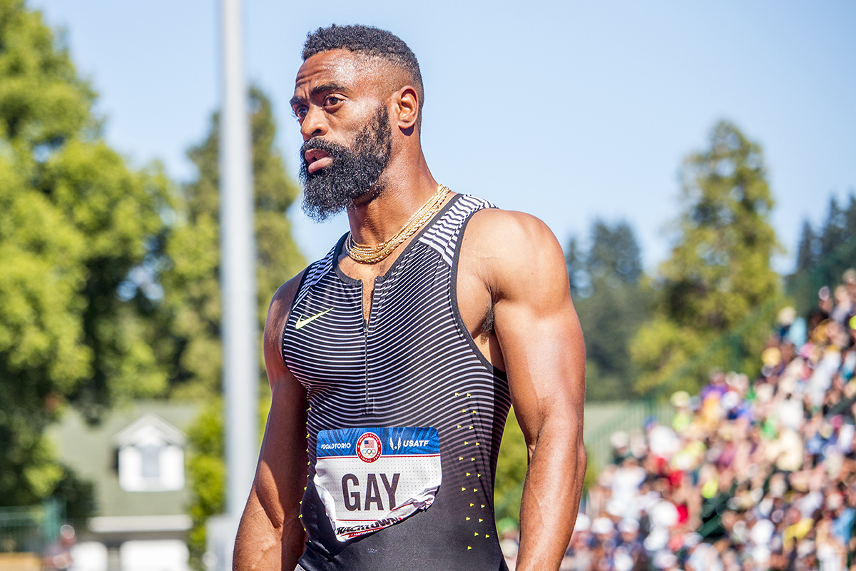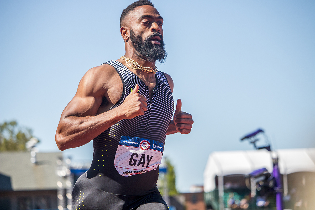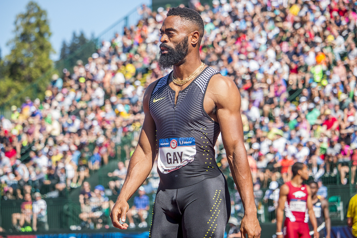 Tyson Gay runs through the finish of the men’s 100 meter dash semi-finals. Day Three of the U.S. Olympic Trials Track and Field were held Sunday at Hayward Field in Eugene, Ore. and will continue through July 10. Photo by Katie Pietzold