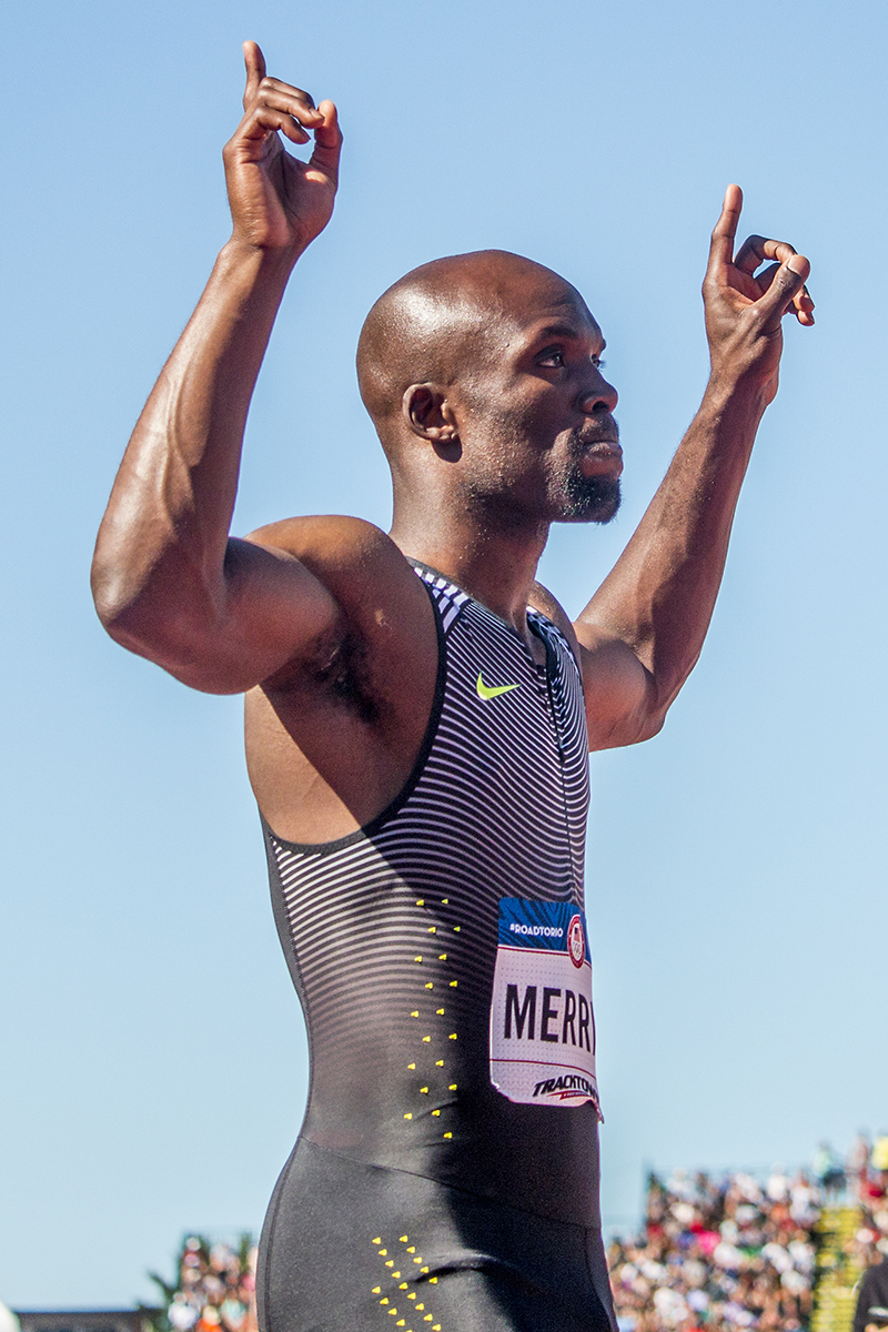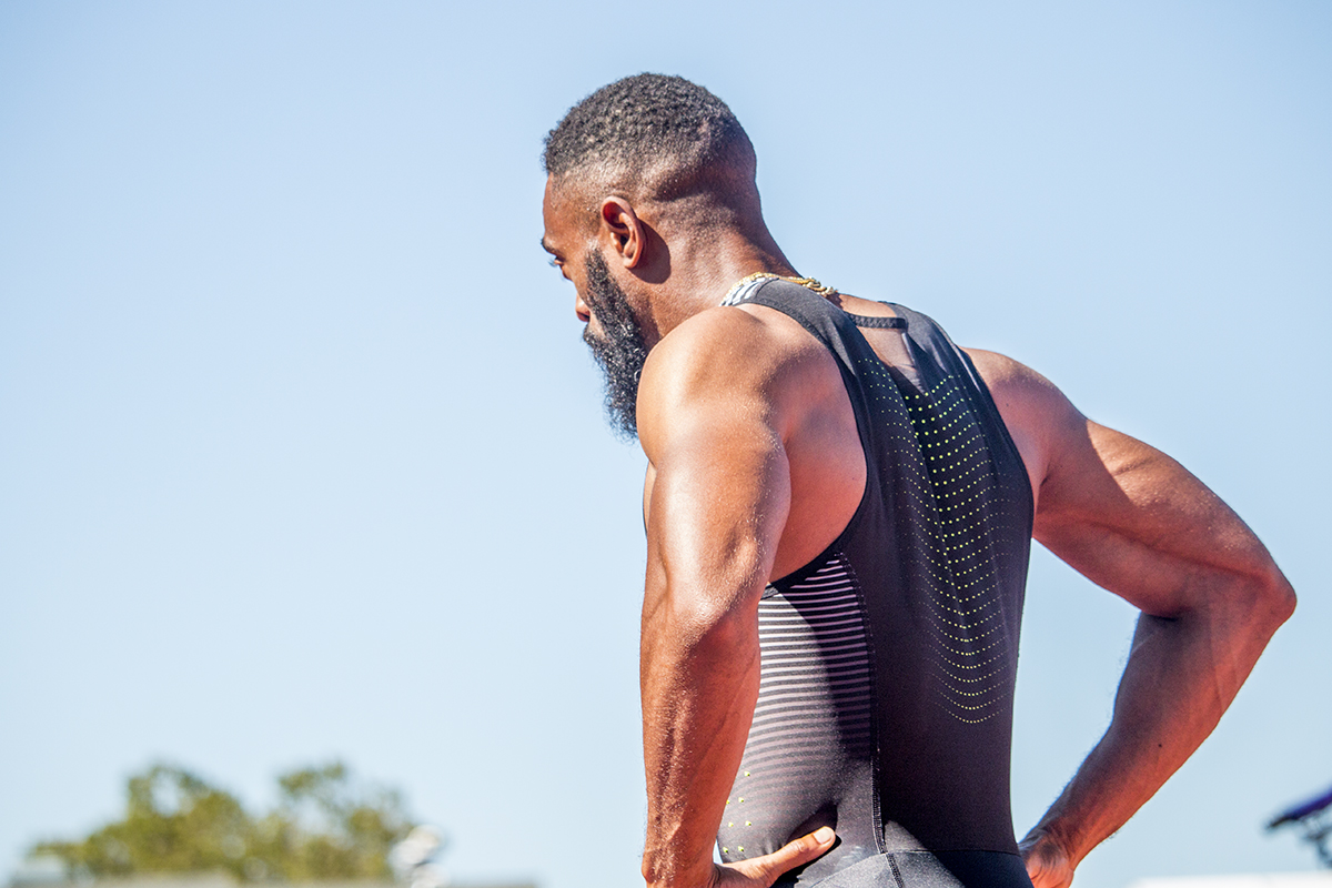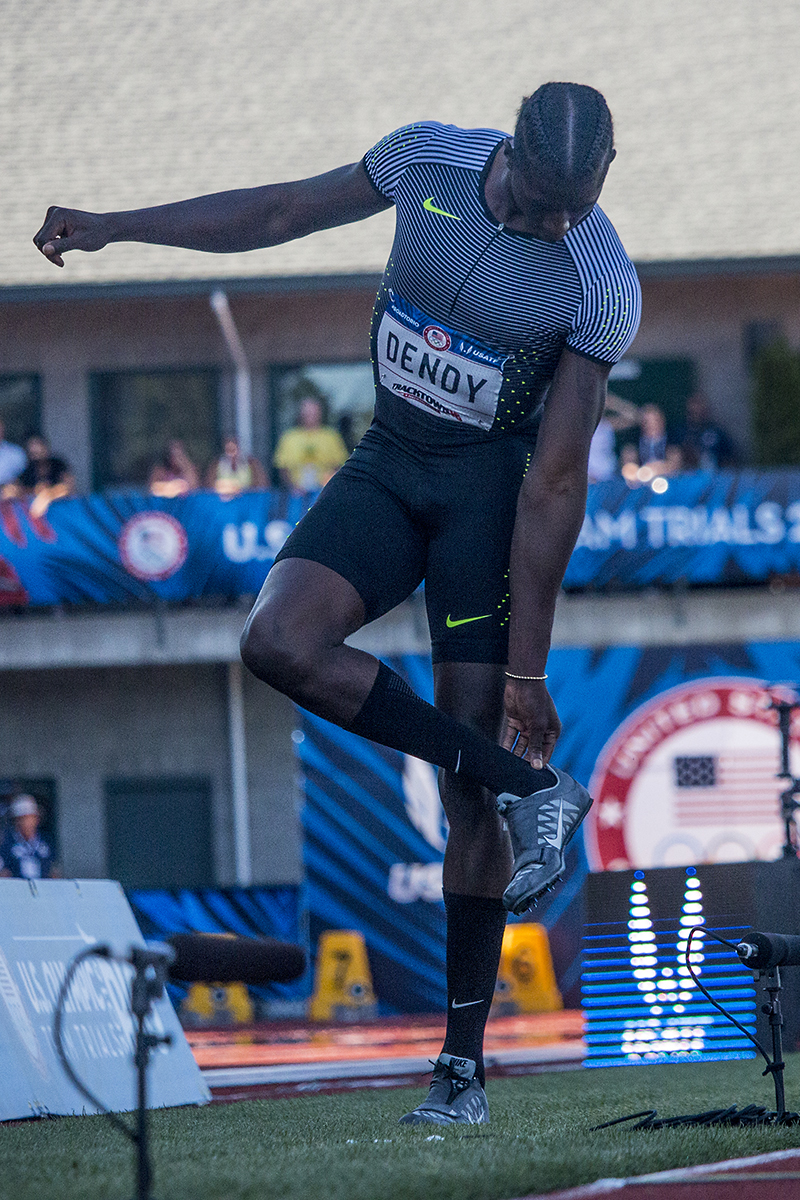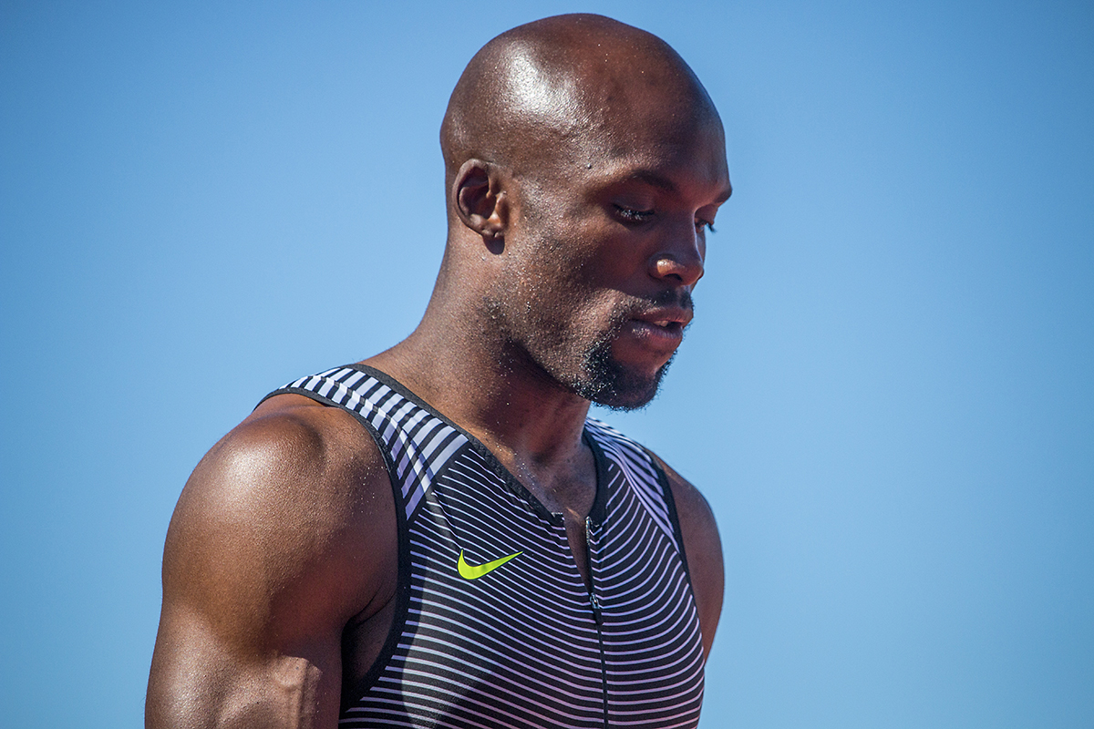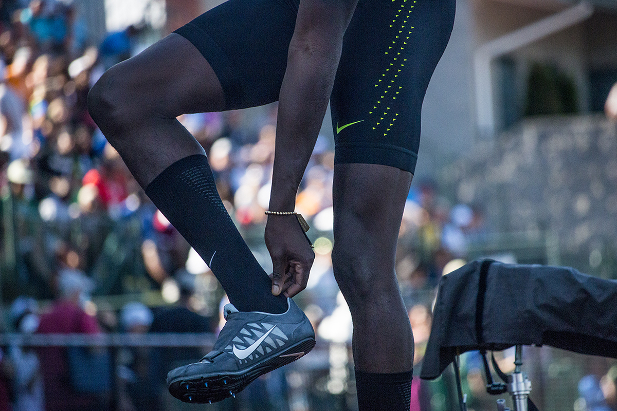 Nike’s LaShawn Merritt prepares for the finals of the men’s 400 meter dash. Merrit will compete in Rio after placing first in 43.97. Day Three of the U.S. Olympic Trials Track and Field were held Sunday at Hayward Field in Eugene, Ore. and will continue through July 10. Photo by Katie Pietzold