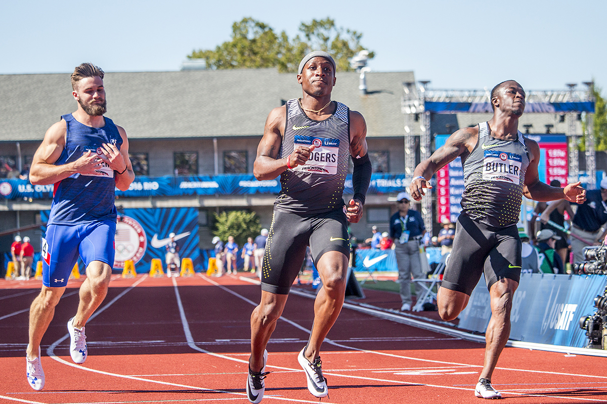 John Teeters, Nike’s Michael Rodgers, and Nike’s Quentin Butler sprint through the finish of the semi-finals in the men’s 100 meter dash. Day Three of the U.S. Olympic Trials Track and Field were held Sunday at Hayward Field in Eugene, Ore. and will continue through July 10. Photo by Katie Pietzold