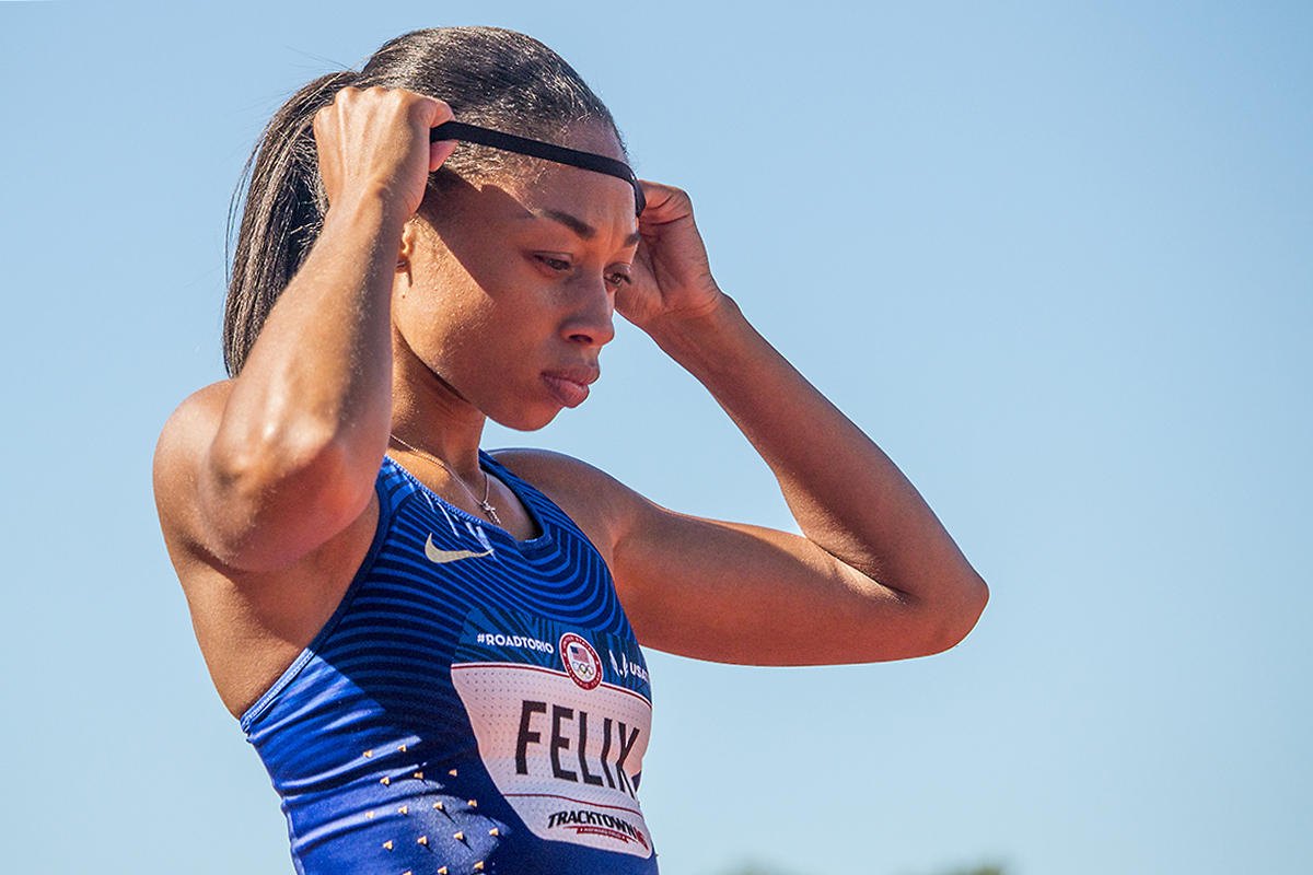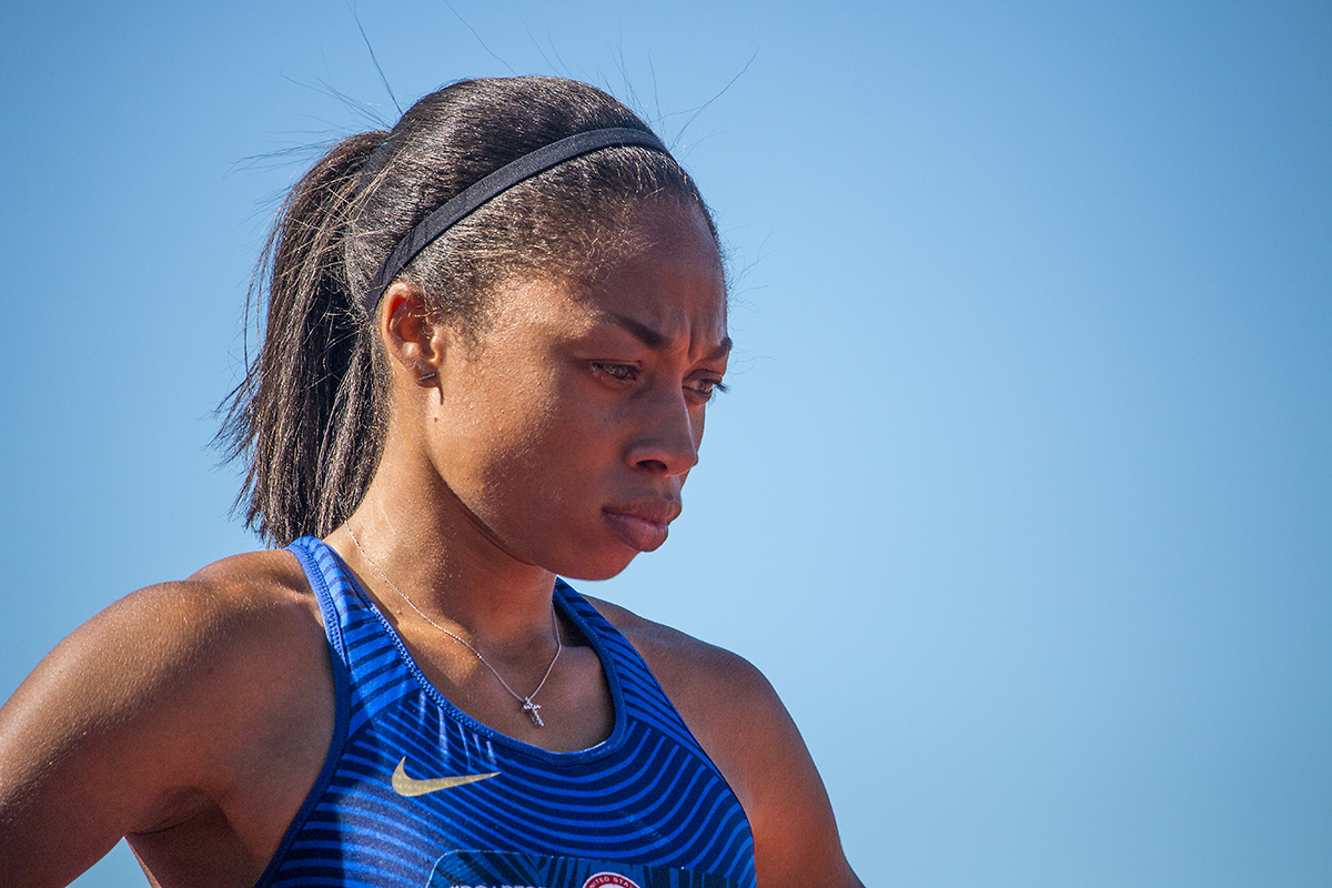 Nike’s Allyson Felix adjusts her headband as she lines up for the 400 meter dash finals. Felix will compete in Rio after placing first in 49.68. Day Three of the U.S. Olympic Trials Track and Field were held Sunday at Hayward Field in Eugene, Ore. and will continue through July 10. Photo by Katie Pietzold