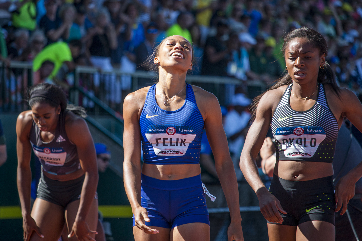 Nike’s Allyson Felix falls to the ground smiling as she places first in the women’s 400 meter finals, sending her to the Olympics for a third time. Day Three of the U.S. Olympic Trials Track and Field were held Sunday at Hayward Field in Eugene, Ore. and will continue through July 10. Photo by Katie Pietzold