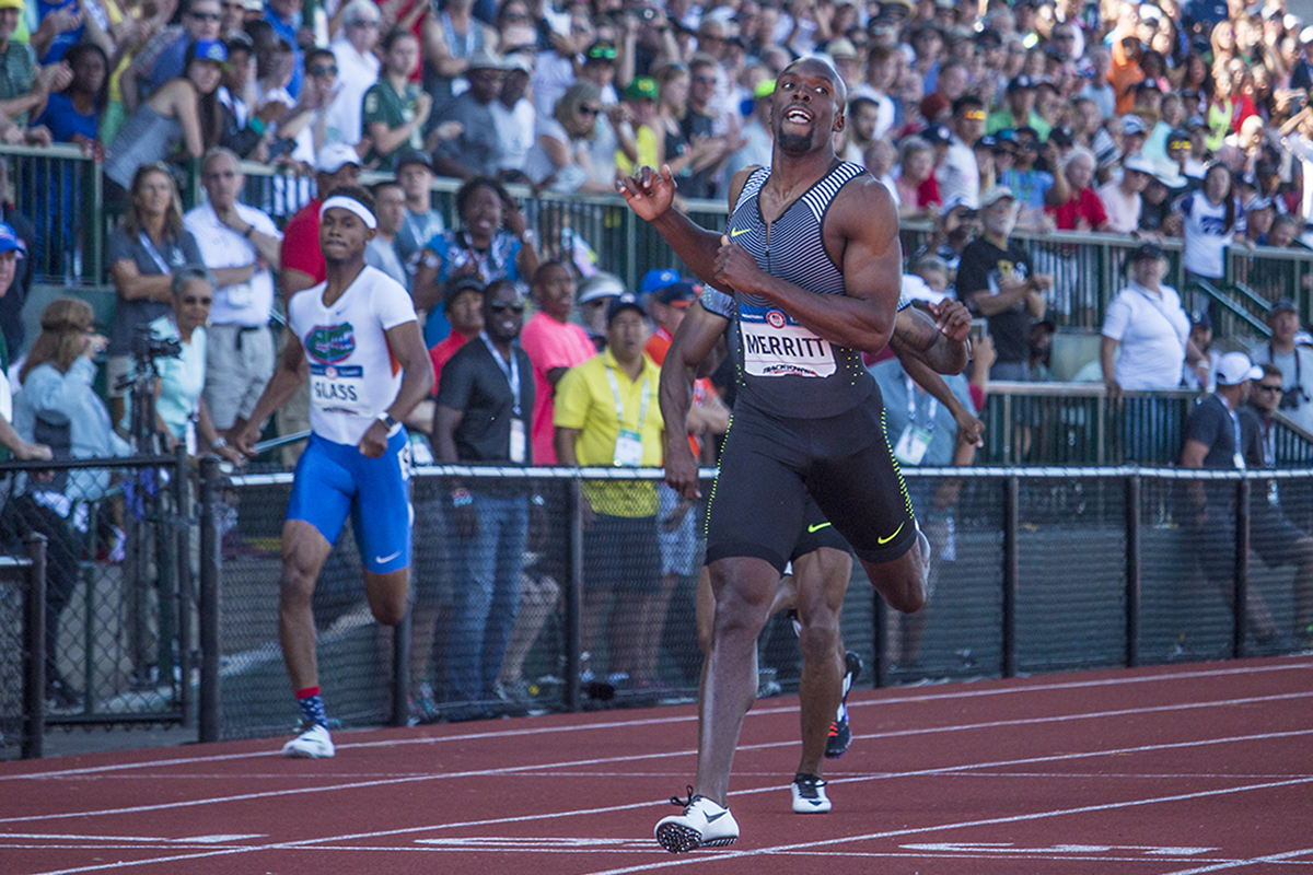 Nike’s LaShawn Merritt crosses the finish line of the men’s 400 meter finals in 43.97. Day Three of the U.S. Olympic Trials Track and Field were held Sunday at Hayward Field in Eugene, Ore. and will continue through July 10. Photo by Katie Pietzold