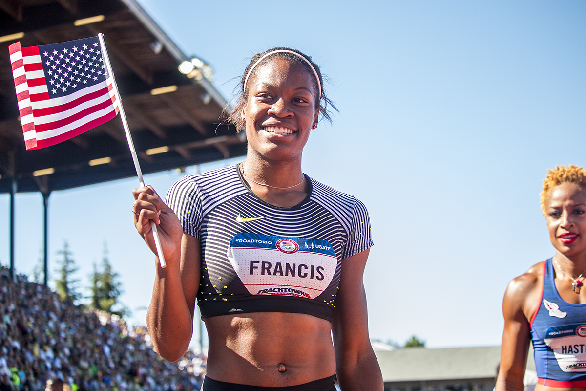 Nike’s Phyllis Francis takes a victory lap around Hayward Field after qualifying for Rio in the women’s 400 meter dash. Francis placed second in 49.94. Day Three of the U.S. Olympic Trials Track and Field were held Sunday at Hayward Field in Eugene, Ore. and will continue through July 10. Photo by Katie Pietzold