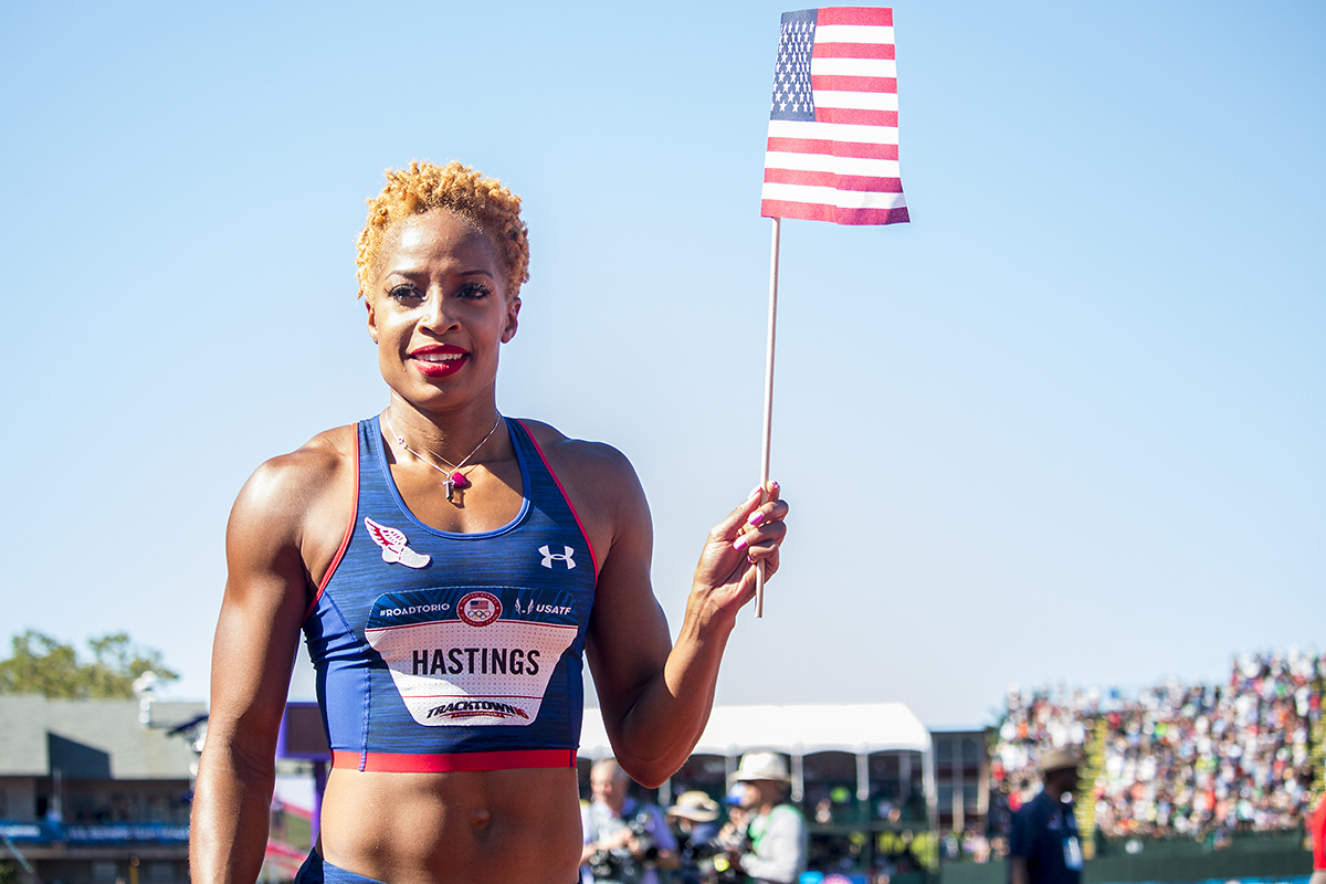 Under Armour’s Natasha Hastings takes a victory lap around Hayward Field after qualifying for Rio in the women’s 400 meter dash. Hastings took third in 50.17. Day Three of the U.S. Olympic Trials Track and Field were held Sunday at Hayward Field in Eugene, Ore. and will continue through July 10. Photo by Katie Pietzold