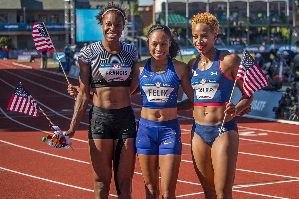 Nike’s Phyllis Francis, Nike’s Allyson Felix, and Under Armour’s Natasha Hastings celebrate after qualifying for Rio in the women’s 400 meter dash. Day Three of the U.S. Olympic Trials Track and Field were held Sunday at Hayward Field in Eugene, Ore. and will continue through July 10. Photo by Katie Pietzold
