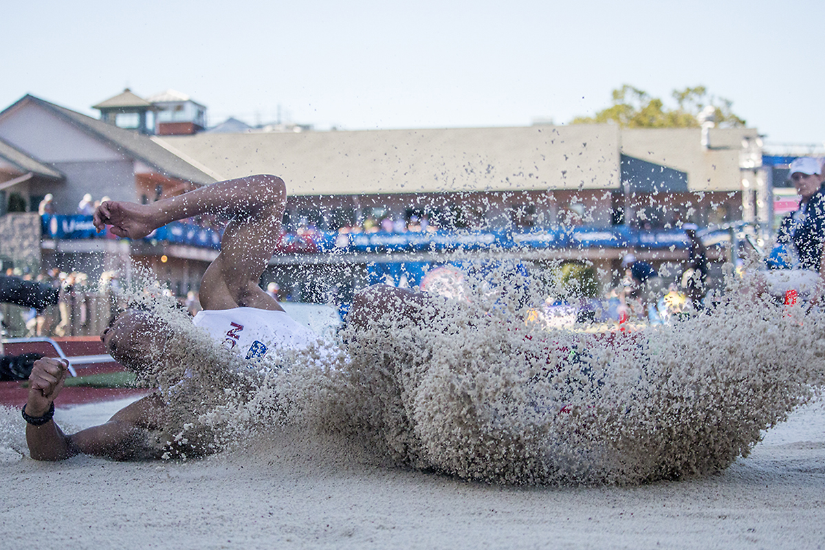 Chadron State’s Damarcus Simpson completes a pass in the men’s long jump finals. Day Three of the U.S. Olympic Trials Track and Field were held Sunday at Hayward Field in Eugene, Ore. and will continue through July 10. Photo by Katie Pietzold