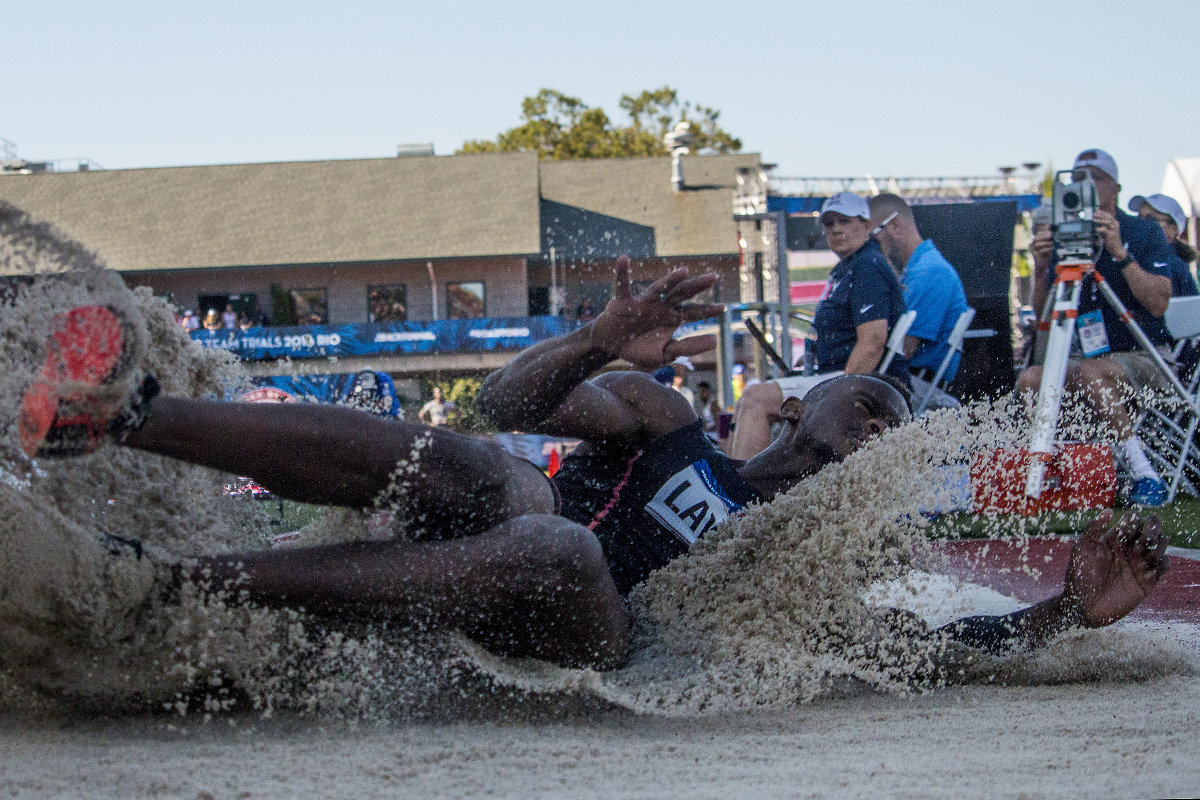 Marquise Goodwin lands an attempt during the men’s long jump finals. Day Three of the U.S. Olympic Trials Track and Field were held Sunday at Hayward Field in Eugene, Ore. and will continue through July 10. Photo by Katie Pietzold