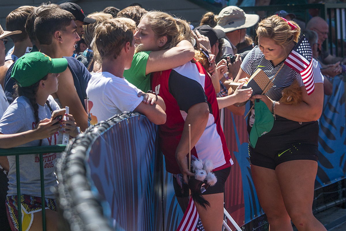 Wisconsin Badger Kelsey Card and Texas A&M Aggie Shelby Vaughn take a celebratory lap around Hayward Field after qualifying for Rio in the women’s discus throw. Day Two of the U.S. Olympic Trials Track and Field were held Saturday at Hayward Field in Eugene, Ore. and will continue through July 10. Photo by Katie Pietzold