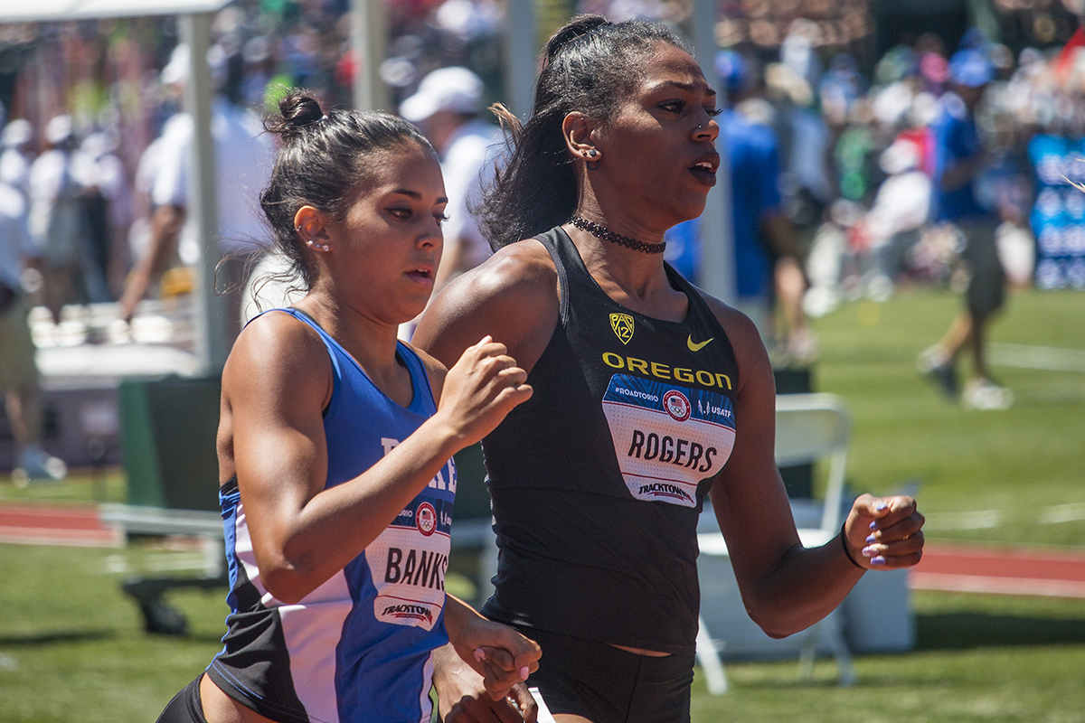 Duke’s Anima Banks and Oregon Duck Raevyn Rogers compete in the semisof the women’s 800m run. Day Two of the U.S. Olympic Trials Track and Field were held Saturday at Hayward Field in Eugene, Ore. and will continue through July 10. Photo by Katie Pietzold