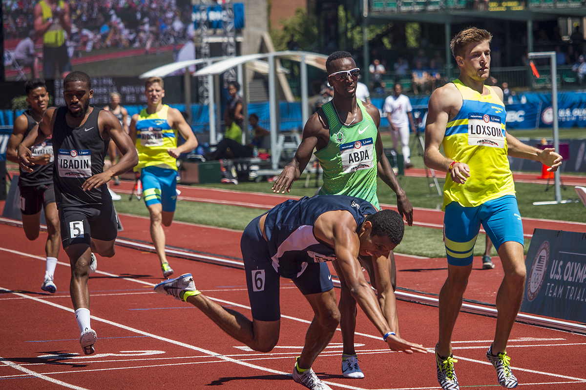 Penn. State’s Isaiah Harris falls during the men’s semis of the 800 meter run. Day Two of the U.S. Olympic Trials Track and Field were held Saturday at Hayward Field in Eugene, Ore. and will continue through July 10. Photo by Katie Pietzold