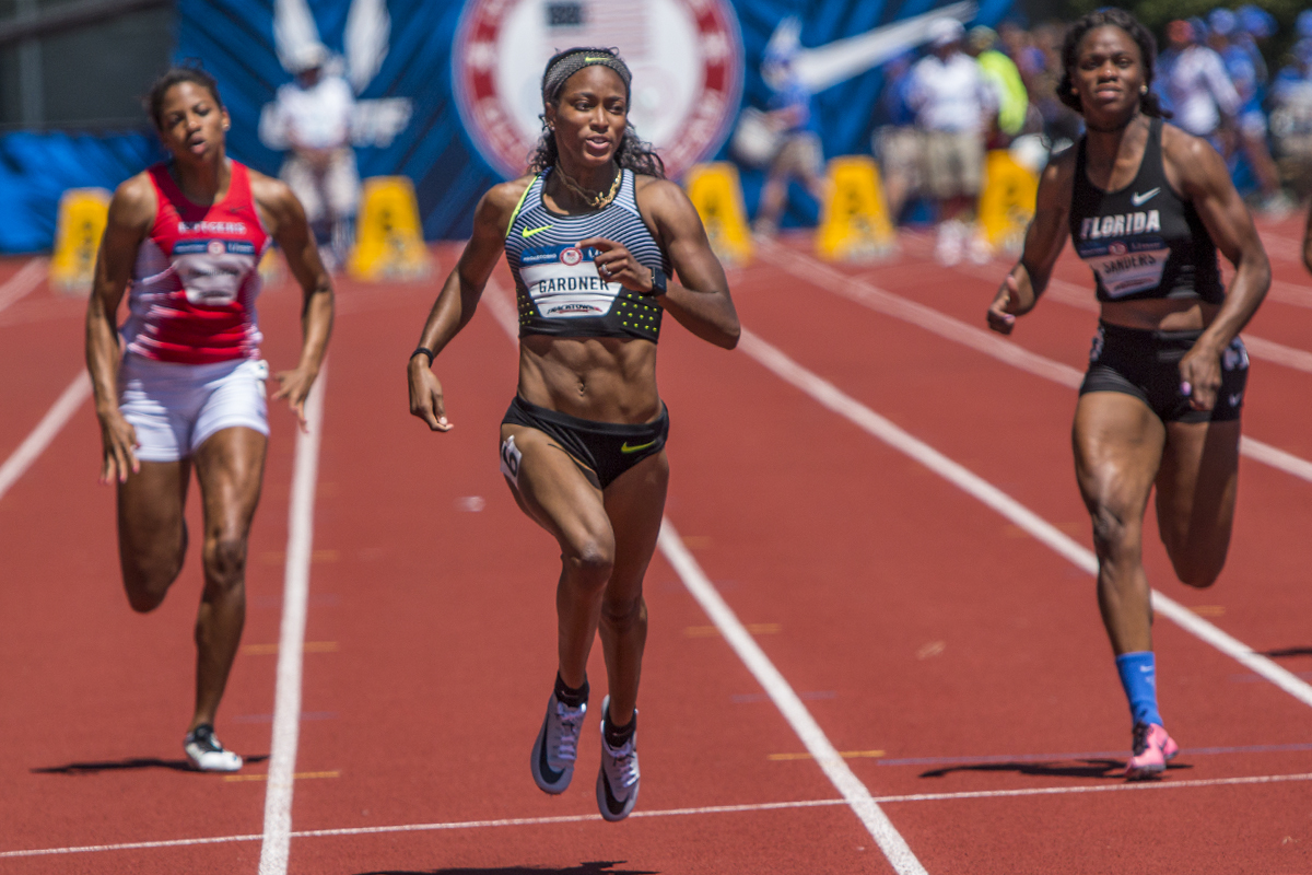 Rutger’s Gabrielle Farquharson and Florida Gator Shayla Sanders attempt to beat Nike’s English Gardner as they approach the finish line. Gardner placed first in 10.90. Day Two of the U.S. Olympic Trials Track and Field were held Saturday at Hayward Field in Eugene, Ore. and will continue through July 10. Photo by Katie Pietzold