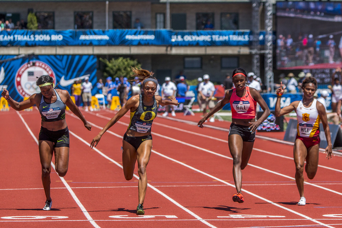 Nike’s Candace McGrone, Oregon Duck Deajah Stevens, Asics’ Candace Hill, and USC Trojan Deanna Hill race to the finish line of the women’s 100 meter dash in the second heat. Day Two of the U.S. Olympic Trials Track and Field were held Saturday at Hayward Field in Eugene, Ore. and will continue through July 10. Photo by Katie Pietzold
