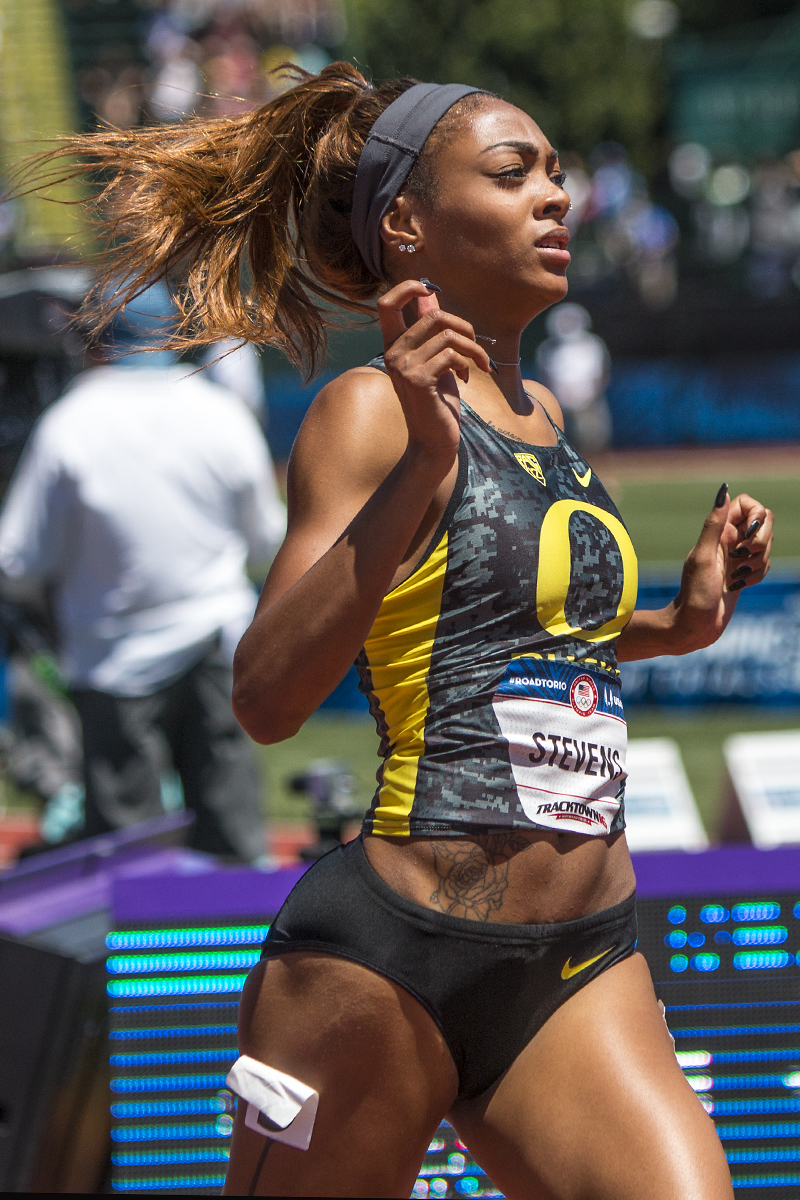 Oregon Duck Deajah Stevens finishes second in the second heat of the women’s 100 meter dash semis. Day Two of the U.S. Olympic Trials Track and Field were held Saturday at Hayward Field in Eugene, Ore. and will continue through July 10. Photo by Katie Pietzold