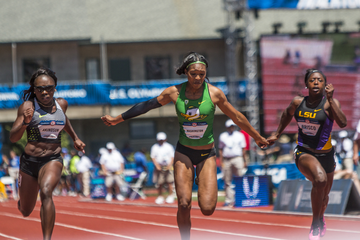Oregon Duck Ariana Washington leans into the finish as she attempts to beat Texas Longhorn Morolake Akinosun and LSU Tiger Mikiah Brisco for first in the third heat of the women’s 100 meter dash semis. Day Two of the U.S. Olympic Trials Track and Field were held Saturday at Hayward Field in Eugene, Ore. and will continue through July 10. Photo by Katie Pietzold