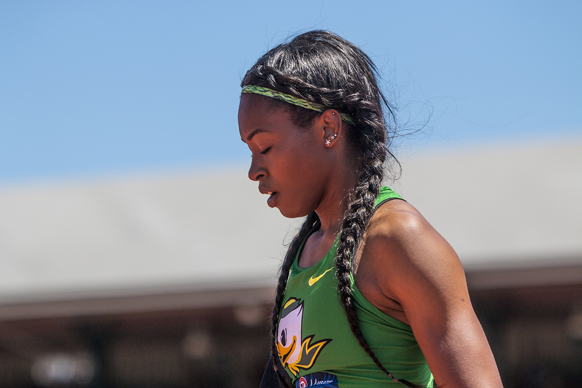 Oregon Duck Ariana Washington catches her breath after racing to the finish in the semis of the women’s 100 meter dash. Washington placed second in her heat with a time of 11.01 and will advance to the finals on Sunday. Day Two of the U.S. Olympic Trials Track and Field were held Saturday at Hayward Field in Eugene, Ore. and will continue through July 10. Photo by Katie Pietzold