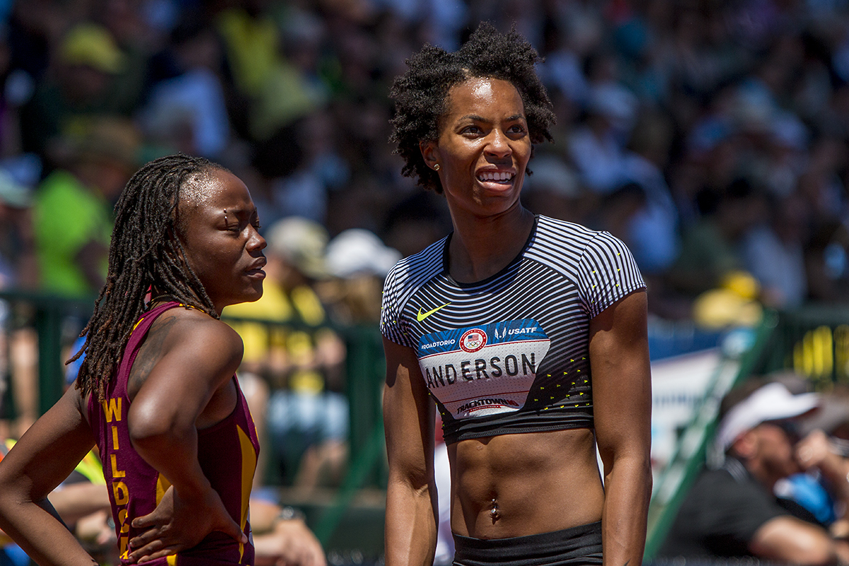 Nike’s Alex Anderson reacts as she sees her time on the display board after running in the semis of the women’s 100 meter dash. Day Two of the U.S. Olympic Trials Track and Field were held Saturday at Hayward Field in Eugene, Ore. and will continue through July 10. Photo by Katie Pietzold