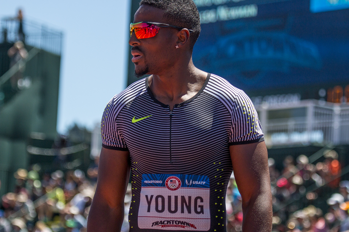 Nike’s Isiah Young waits for his time to be announced after running the in the prelims of the men’s 100 meter dash. Young false started and ran the race under protest, therefore his status to compete in the men’s semis is to be determined. Day Two of the U.S. Olympic Trials Track and Field were held Saturday at Hayward Field in Eugene, Ore. and will continue through July 10. Photo by Katie Pietzold