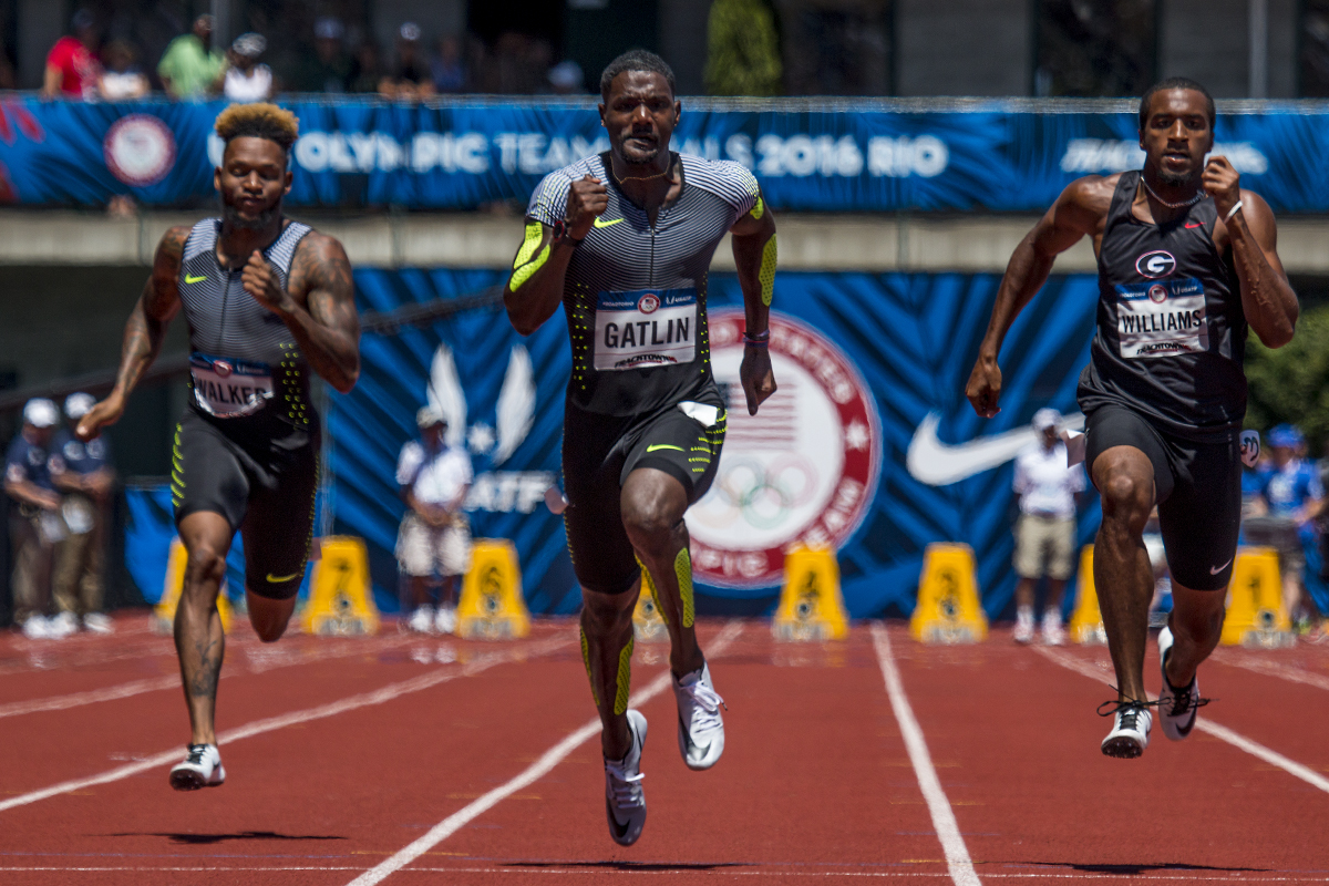 Nike’s Justin Walker, Nike’s Justin Gatlin, and Georgia Bulldog Kendal Williams compete in the prelims of the men’s 100 meter dash. Day Two of the U.S. Olympic Trials Track and Field were held Saturday at Hayward Field in Eugene, Ore. and will continue through July 10. Photo by Katie Pietzold
