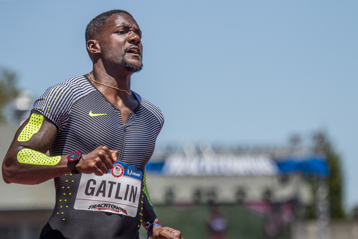 Nike’s Justin Gatlin competes in the prelims of the men’s 100 meter dash. Gatlin won a bronze medal in the event at the London 2012 Olympics and a gold medal in the Athens 2004 Olympics. Day Two of the U.S. Olympic Trials Track and Field were held Saturday at Hayward Field in Eugene, Ore. and will continue through July 10. Photo by Katie Pietzold