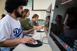 Students in the School of Journalism and Communications at the University of Oregon work on editing their final photo and video projects during dead week. It’s a typical day to see the editing labs in Allen Hall filled with students spending hours of their day, sometimes all-nighters, to complete their projects.